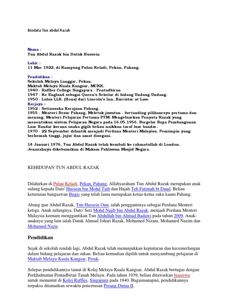 Tun Abdul Razak Datuk Hussein Docx Tun Abdul Razak Datuk Hussein Nama Nur Sarah Binti Jauhari No Pelajar 2019405842 Pengenalan Biodata Tun Abdul Razak Course Hero