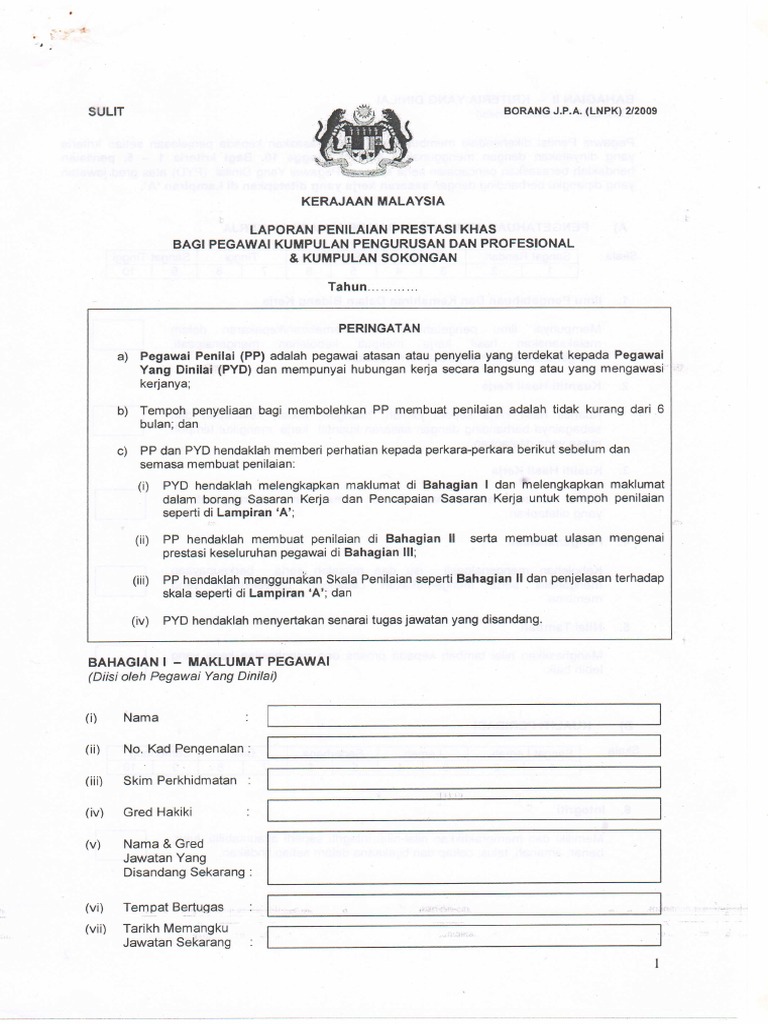Kerajaan Malaysia Laporan Penilaian Borang J P A Lnpk 2 2009 Kerajaan Malaysia Laporan Penilaian Prestasi Khas Bagi Pegawai Kumpulan Pengurusan Dan Profesional Kumpulan Sokongan