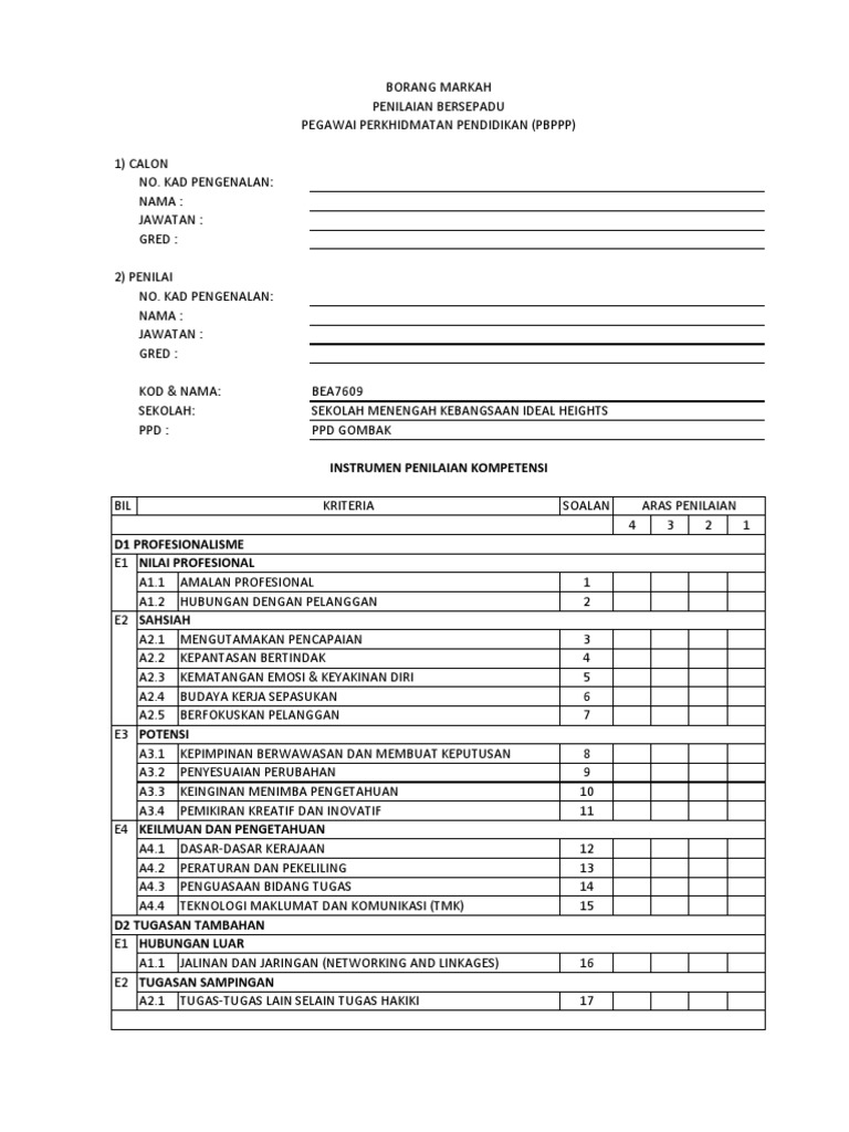 Borang Skor Penilaian Bersepadu Pegawai Perkhidmatan Pendidikan Pbppp Apdm Kehadiran