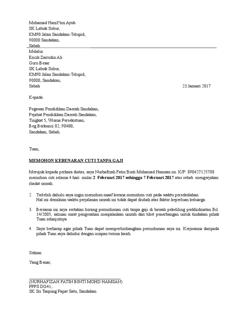 Surat Rasmi Untuk Permohonan Cuti Tanpa Gaji Persoalan O
