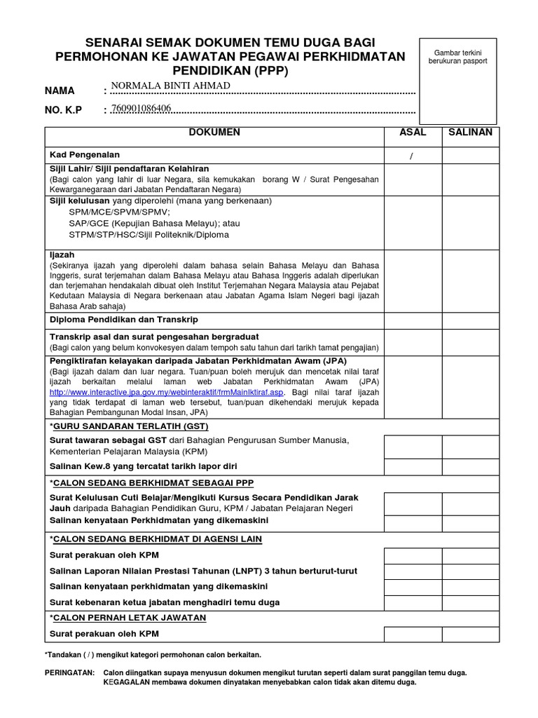 Borang Senarai Semak Temu Duga Ke Jawatan Ppp