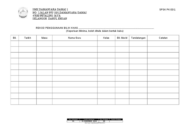 Lampiran Pk03 1 Rekod Penggunaan Bilik Khas Doc
