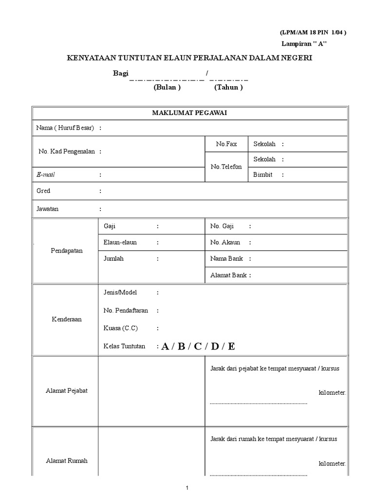 Ini adalah softcopy borang tuntutan elaun perjalanan untuk dalam negeri. Semenanjung malaysia rgred rm rutama khas a dan ke atas 80 00 rutama khas b dan c 75 00 r53 dan 54 70 00 r45 hingga 52 60 00 r41 hingga 44 55 00 r27 hingga 40 45 00 r17 hingga 26 40 00 r16 dan ke bawah. Sekiranya tuntutan lebih daripada bilangan ruangan yang ada sila gunakan kertas lampiran. Pekeliling perbendaharaan malaysia wp1 4 tuntutan elaun perjalanan kenderaan kiraan kilometer jarak kadar sekilometer jumlah rm 500 km pertama rm sen km.
