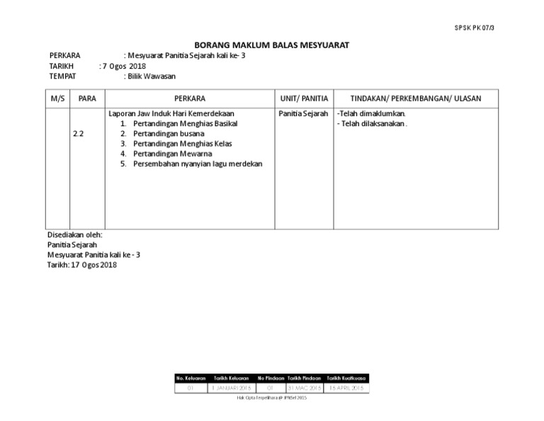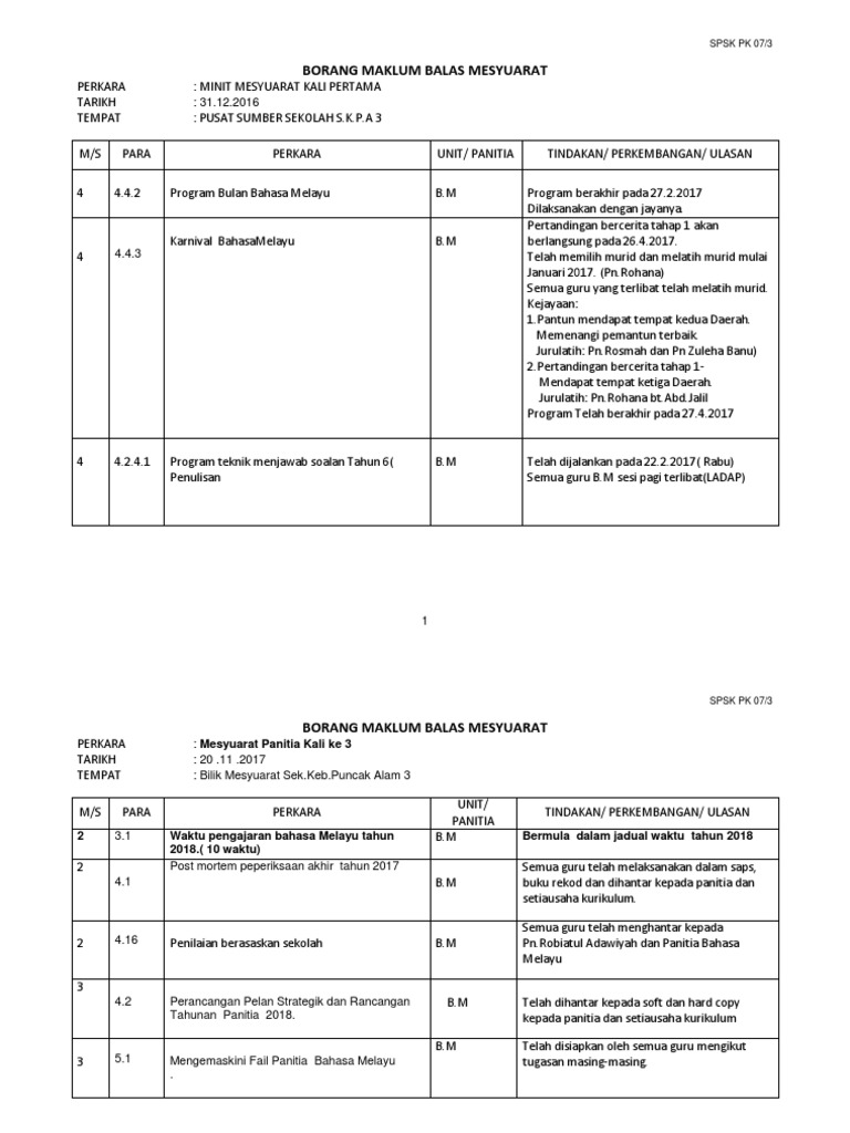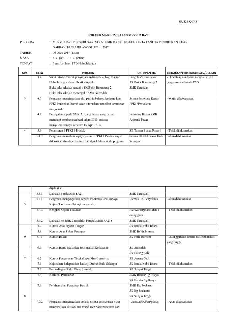 Borang Pk 07 5 Maklum Balas Minit Mesyuarat Kali Pertama 2017