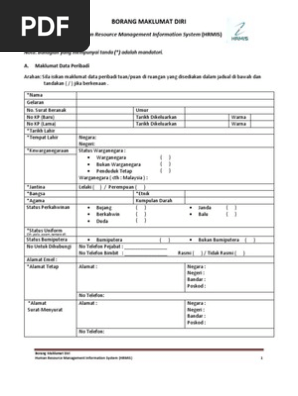 Borang Maklumat Peribadi Kakitangan Jabatan Sumber Manusia