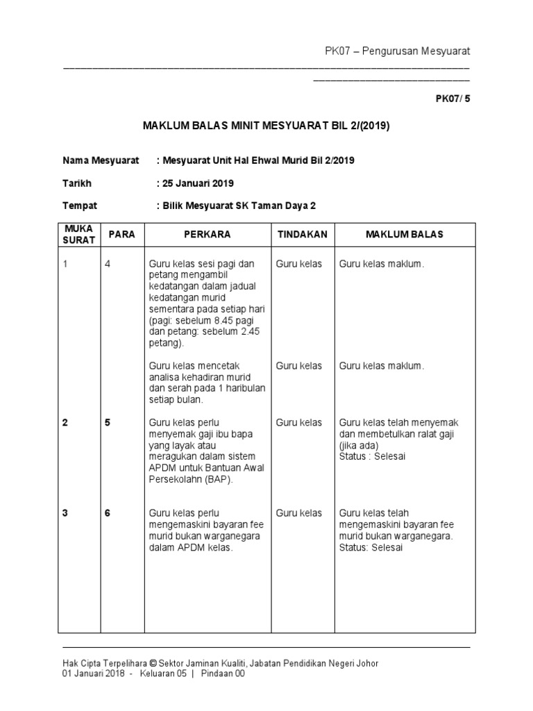 Borang Pk 07 5 Maklum Balas Minit Mesyuarat Kali Pertama 2017