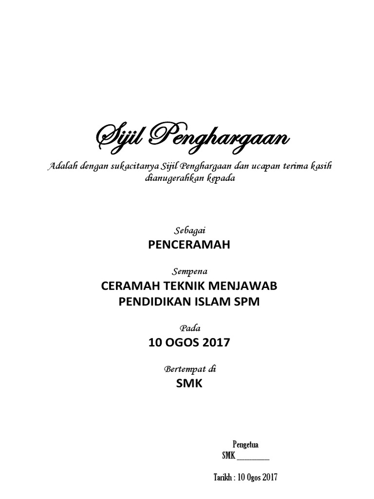 Contoh Sijil Penghargaan Kepada Penceramah