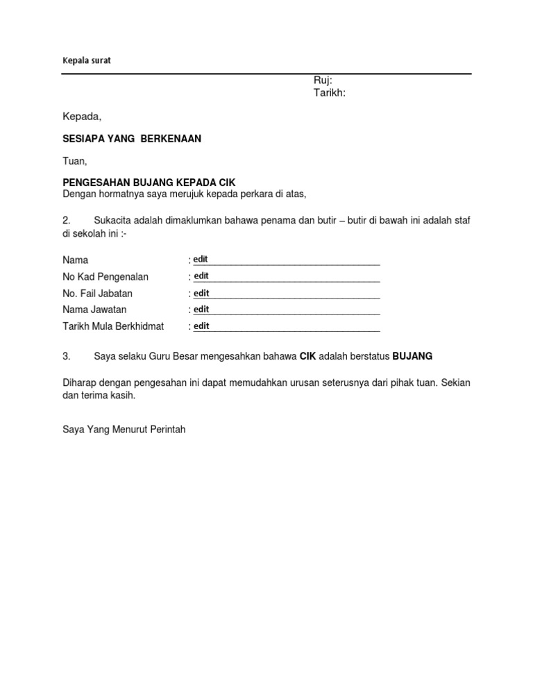 Contoh Surat Pengesahan Bujang