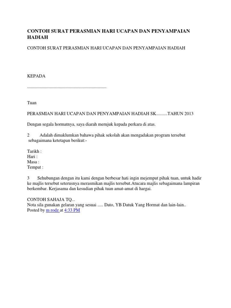 Contoh Surat Perasmian Hari Ucapan Dan Penyampaian Hadiah