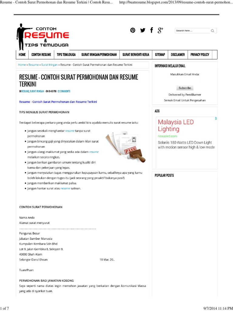 Set Lengkap Contoh Resume Dan Surat Iringan Contoh Resume