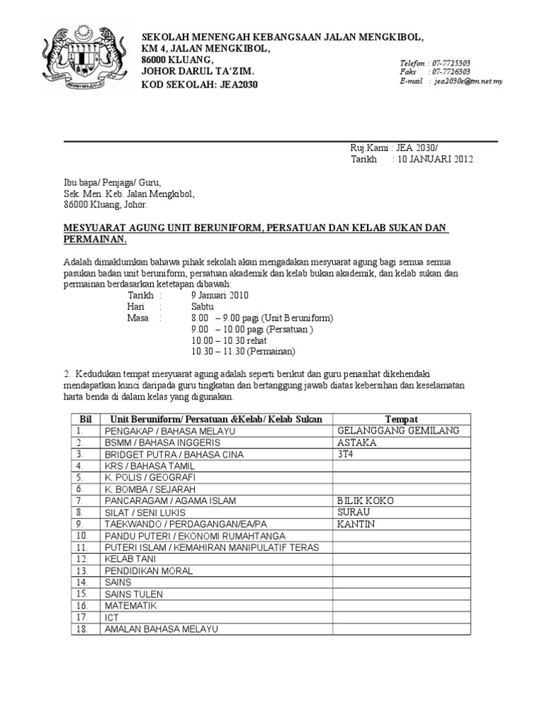 Contoh Surat Panggilan Mesyuarat Agung Unit Kokurikulum
