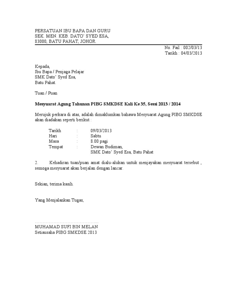 Surat Jemputan Ke Mesyuarat Agung Pibg Kali Ke 14 2016