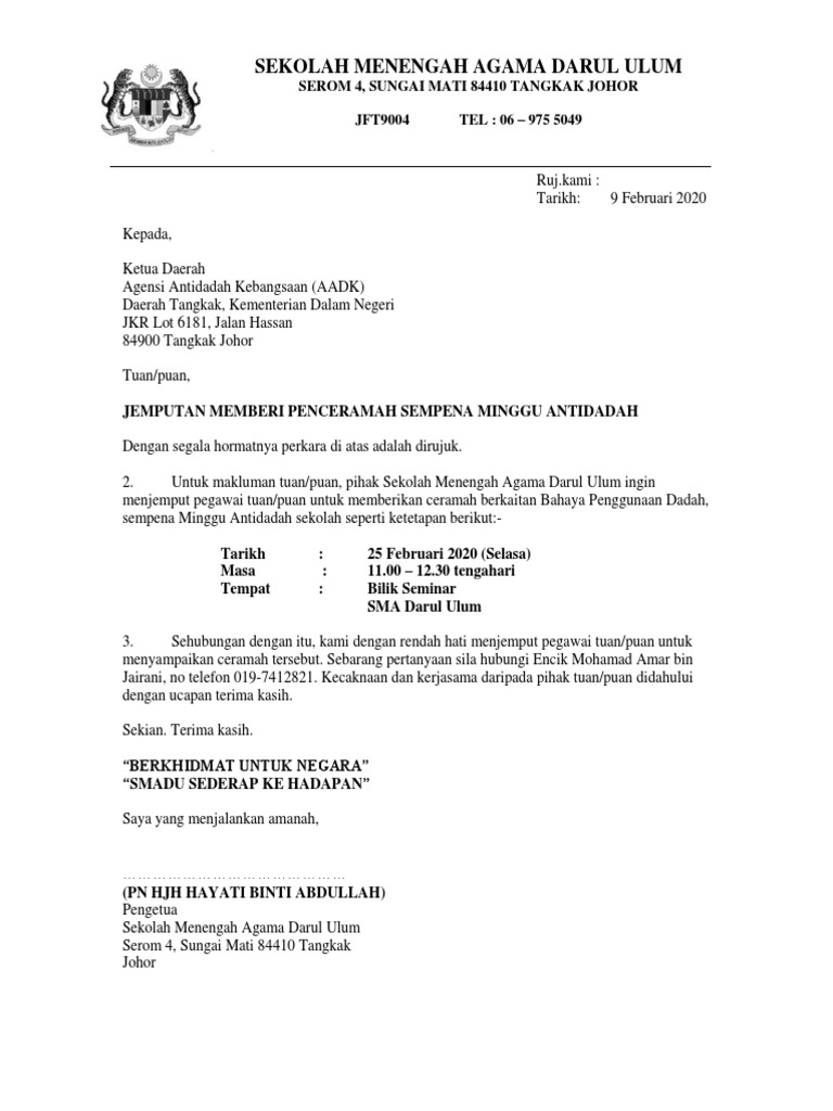 Contoh Surat Rasmi Jemputan Penceramah Rasmi F