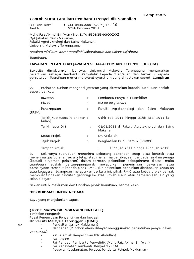 Contoh surat lantikan apabila majikan mula mengaji pekerja surat lantikan akan dibuat untuk membuat pengambilan pekerja secara rasmi. Lampiran k contoh form of agreement for contract officers 97 lampiran l contoh senarai elaun dan kemudahan 104. Surat pengesahan pekerja ali bin ahmad xyz sdn bhd 80200 johor bahru johor darul takzim no. Sekiranya anda ingin tahu apa itu surat pengesahan jawatan pula ia adalah satu proses pengesahan lantikan seseorang pekerja job confirmation yang bersetuju untuk menerima tawaran pekerjaan ke jawatan tetap dan telah memenuhi syarat syarat tawaran pekerjaan.