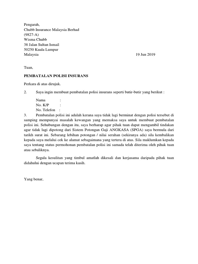 Surat Pembatalan Polisi Insurans Pdf Document