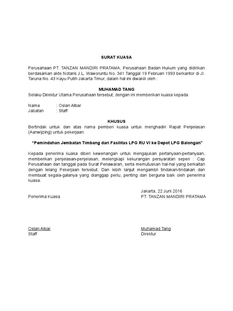 Contoh Surat Perwakilan Kuasa Untuk Tender