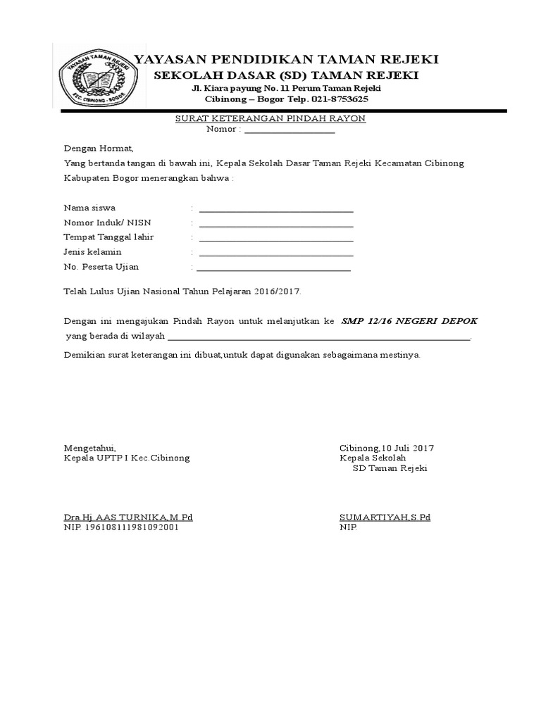 Contoh Surat Pindah Sekolah Paud Format Doc Sekolah Kurikulum Kepala Sekolah