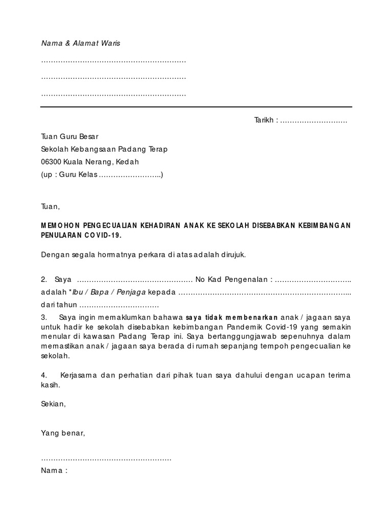 Contoh Surat Rasmi Pemakluman Anak Tidak Hadir Ke Sekolah Kerana Covid 19