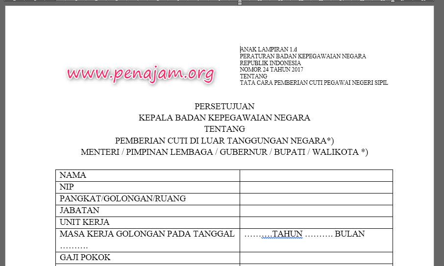 Lampiran 1d Per Bkn Nomor 24 Tahun 2017 Tentang Persetujuan Kepala Badan Kepegawaian Negara Tentang Pemberian Cuti Di Luar Tanggungan Negara