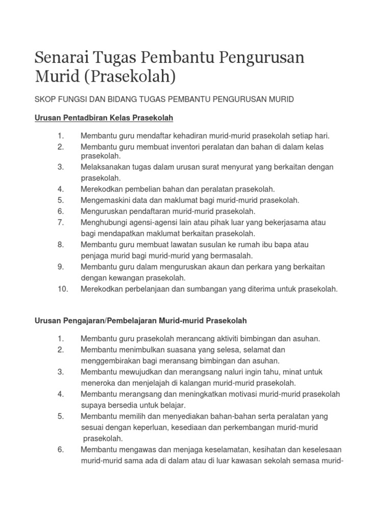 Senarai Tugas Harian Pembantu Pengurusan Murid Prasekolah