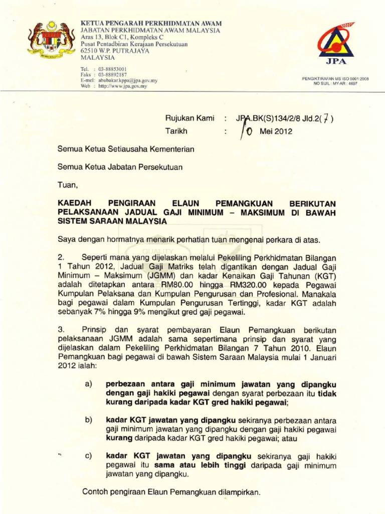 Surat Edaran Jpa Bk S 134 2 8 Jld 2 7 Kaedah Pengiraan Elaun Pemangkuan Berikutan Pelaksanaan Jadual Gaji Minimum Maksimum Di Bawah Sistem Saraan Malaysia