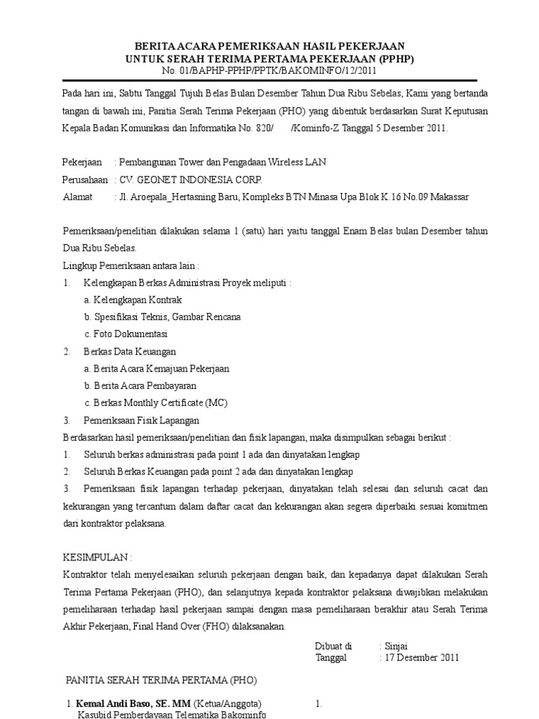 Doc Contoh Surat Berita Acara Serah Terima Pekerjaan Resmi Nekopencil