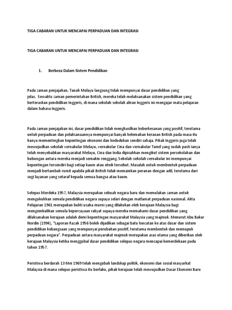 Tiga Cabaran Untuk Mencapai Perpaduan Dan Integrasi