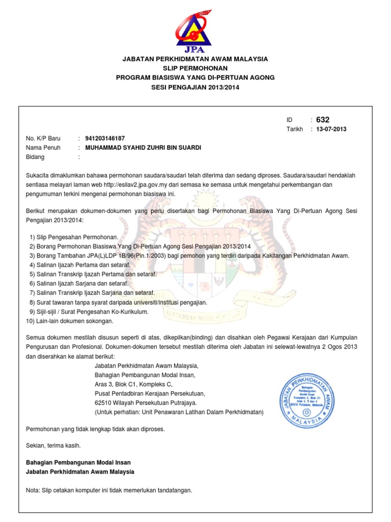 Slip Mohon Biasiswa Agong Jpa2012 941203146187